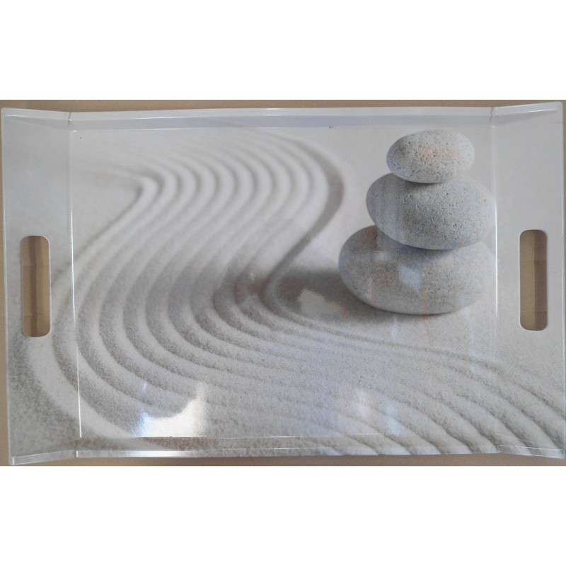 Plateau vitrifié Zen garden de Delta Facile à porter grâce à ses deux poignées latérales, léger mais très résistant, durable, et lavable très facilement, ne passe pas au micro-ondes. Dimensions: 47x31cm Matière: Plastique